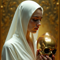 На картинке изображена женщина с закрытыми глазами. На ней белые одеяния и капюшон, скрывающий лицо. В руках она держит золотой череп, а на заднем плане видны различные декоративные предметы, напоминающие религиозные символы.