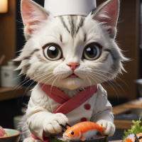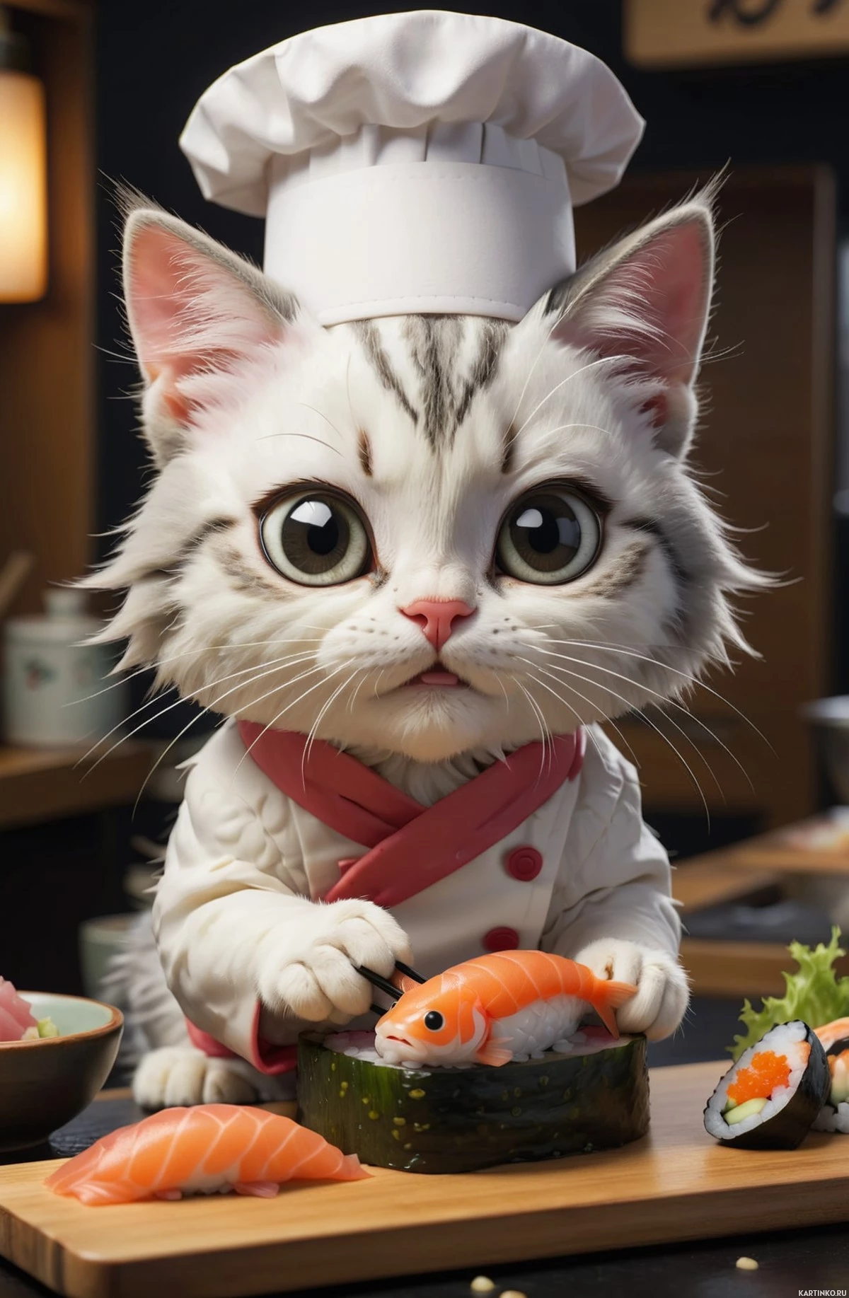 a white coat with red trim and a chef's hat on its head. It has an apricot tied around its waist. In its paws, the cat holds a knife and appears to be in the process of cutting or spreading something onto slices of fish arranged in a bowl before it. The background suggests a domestic kitchen setting with