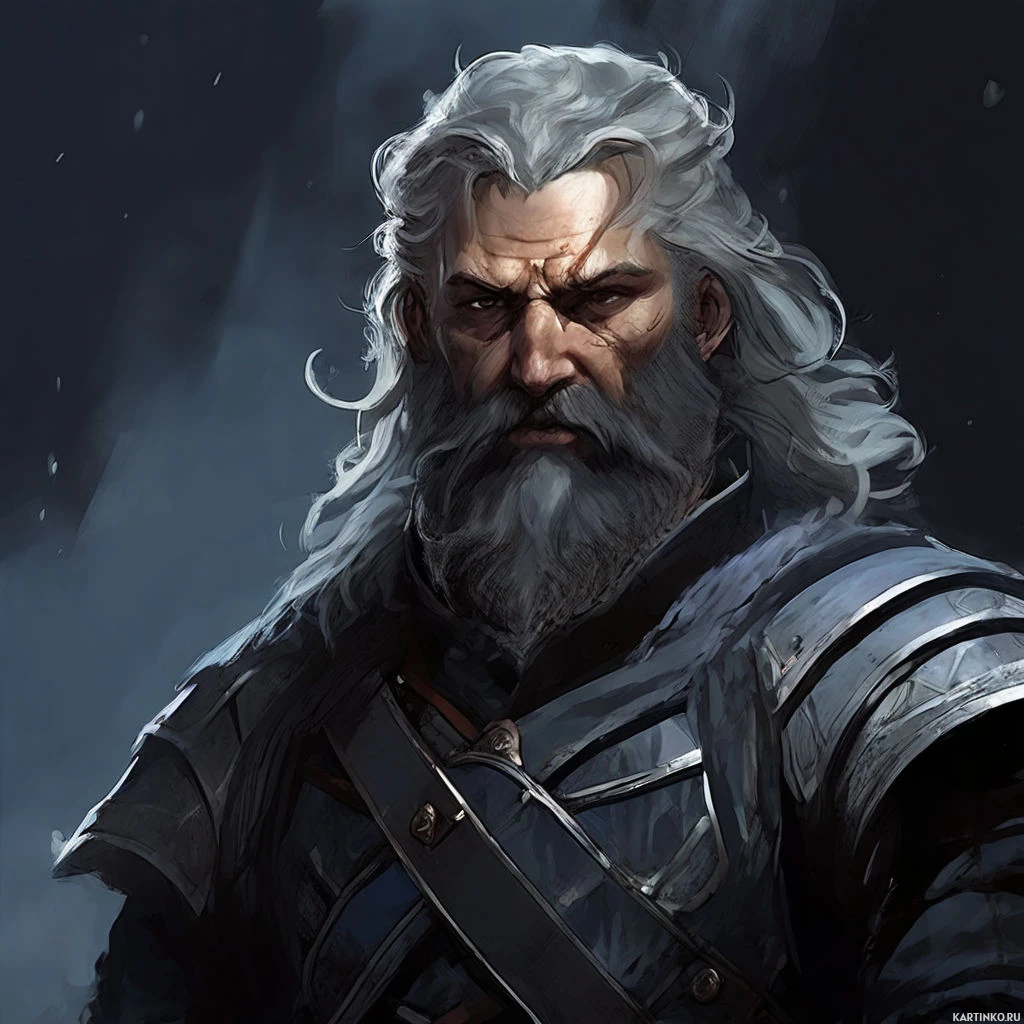 white hair and a beard, suggesting a mature age. He is wearing a dark blue outfit with
