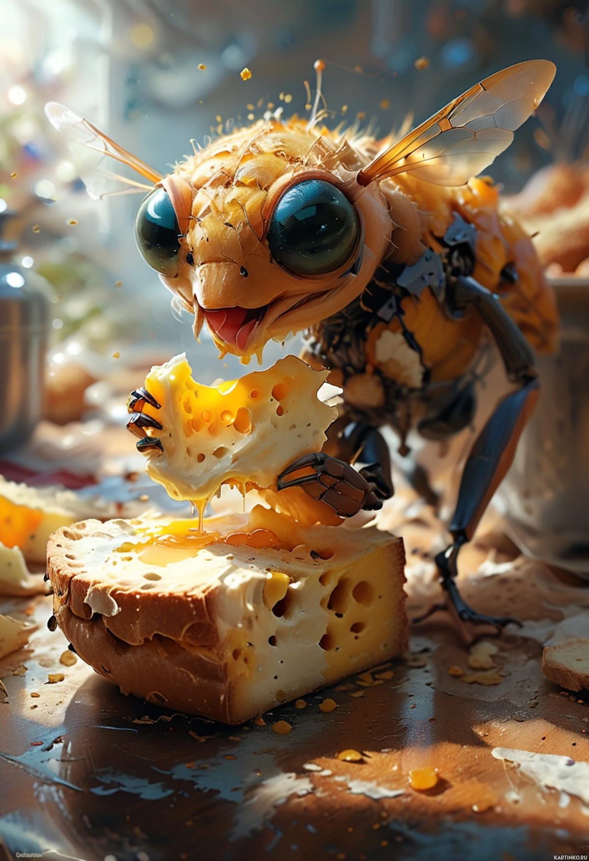 robotic bee is in the act of eating, using its robotic arms to manipulate food items that are on a surface in front of it. The setting seems to be