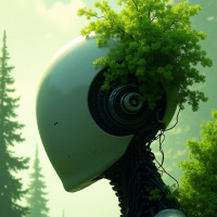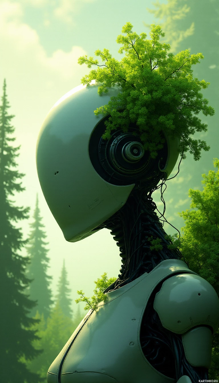 На картинке изображён робот в научно-фантастическом стиле, стоящий на фоне, похожего на лес или лесистую местность. У робота гуманоидная форма: торс, руки и голова, но вместо лица — гладкая поверхность без каких-либо черт, таких как глаза или рот. Он окружён зеленью, листья и ветви переплетаются у него на шее и спине. Общий стиль картинки намекает на видеоигру или цифровое произведение искусства, созданное для передачи характерных мотивов научной фантастики.