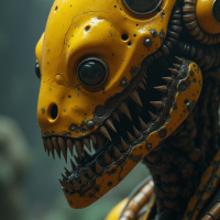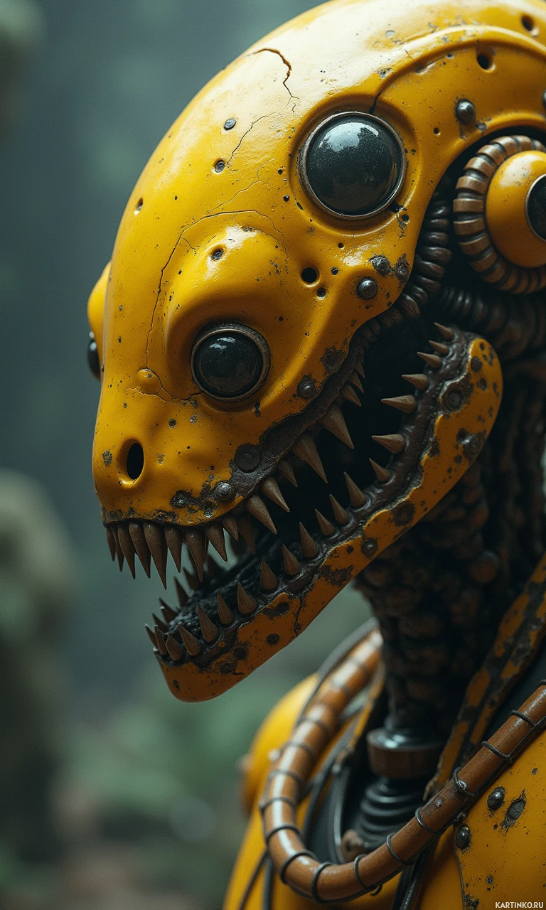 the science fiction genre, specifically resembling a robot with a monstrous appearance. It features an exoskeleton that is predominantly yellow with metallic components and large, prominent