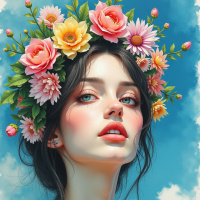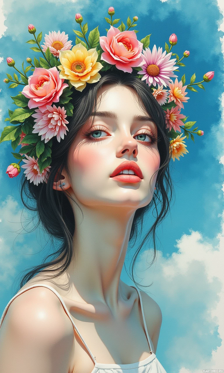 На картинке изображена женщина с закрытыми глазами, в венке из ярких цветов, преимущественно розовых и жёлтых, с несколькими зелёными листьями. У неё каштановые волосы, собранные от лица. Выражение лица нейтральное. На ней лёглая майка без рукавов. На заднем плане — голубое небо с белыми облаками, что указывает на дневное время и открытое пространство.