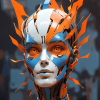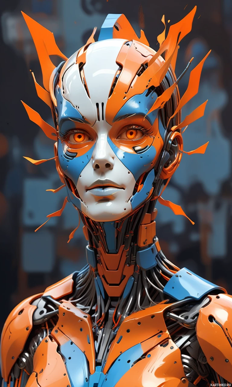 На картинке изображена гуманоидная фигура с очень детализированным и красочным дизайном, который ассоциируется с научной фантастикой или робототехникой. У фигуры черепообразное лицо с острыми зубами, оранжевые перьеподобные структуры на голове, синие акценты, подчеркивающие отдельные детали, и смесь металлических и органических текстур, покрывающих тело. В целом, внешний вид сложный и замысловатый, что говорит о высоком уровне мастерства или цифровой графики при создании.