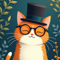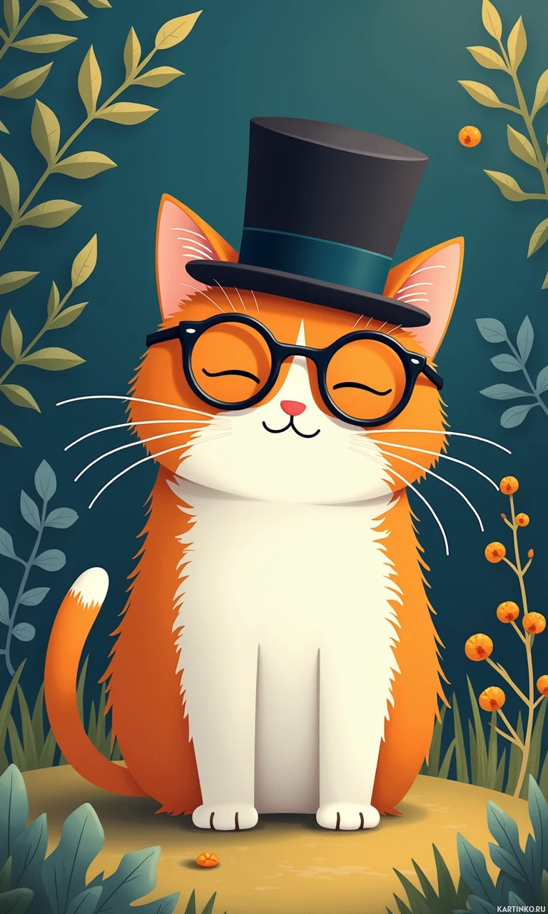 Рыжий полосатый кот с закрытыми глазами, в черном цилиндре и очках, сидит на фоне темного пространства с золотыми акцентами и зеленой растительностью.