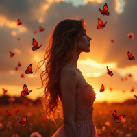 The image features a woman standing in an open field at sunset. She is wearing a pink dress and has long, wavy hair that falls over her shoulders. Her gaze is directed away from the camera, suggesting she might be looking towards something outside of the frame. Behind her, there are orange clouds in the sky, indicative of the time being either sunrise or sunset. Scattered throughout the scene are butterflies flying towards the light, adding a sense of movement to the otherwise still image. The field is adorned with wildflowers and tall grasses, which are illuminated by the warm colors of the sky.