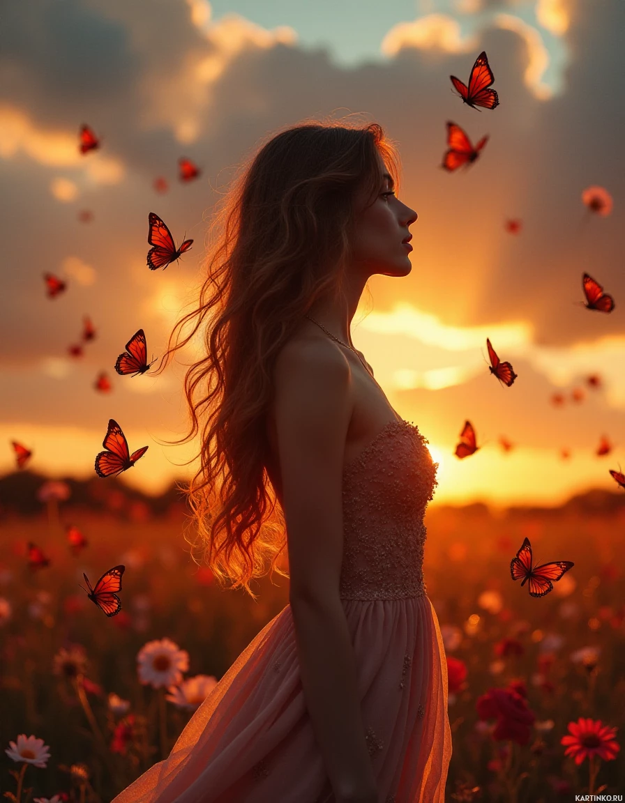 На картинке изображена женщина, стоящая в поле на закате. На ней розовое платье, а длинные волнистые волосы рассыпаны по плечам. Её взгляд направлен вдаль, словно она смотрит на что-то за пределами кадра. На заднем плане — оранжевые облака, указывающие на то, что это либо восход, либо закат солнца. По всей сцене летают бабочки, стремясь к свету, добавляя динамики в статичную картинку. Поле украшено полевыми цветами и высокой травой, залитой тёплыми красками неба.