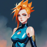 The image features a young woman with vibrant red hair styled in a spiky fashion. She has light skin and her facial expression is neutral, looking directly at the camera. Her makeup includes dramatic eyeliner and lipstick. She is wearing a sleek blue bodysuit that appears to be form-fitting and has cutouts on the chest area. The suit also has golden detailing, likely indicating some sort of armor or protective gear. Around her waist, there's a utility belt with various tools or weapons attached to it. The background is colorful and appears to be digitally manipulated to resemble clouds against a sky, which gives the image a surreal or artistic feel. The lighting is soft and even, highlighting her features without creating harsh shadows.