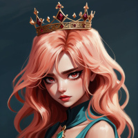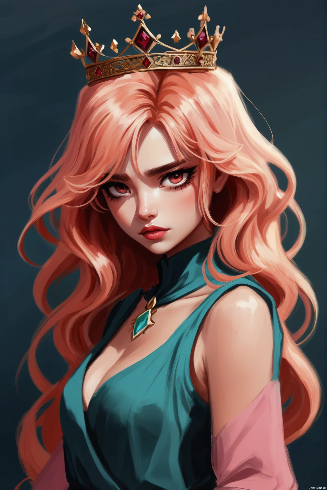 На картинке молодая женщина с розовыми волосами, уложенными волнами, и спокойным выражением лица смотрит прямо в камеру. У нее светлая кожа, и она одета в темный топ без бретелек, который кажется сделанным из глянцевой, блестящей ткани, возможно, кожи или похожего синтетического материала. У нее четко очерченные брови и тени, а губы слегка подкрашены помадой нейтрального оттенка. На голове у нее корона с множеством зубцов и, кажется, небольшими драгоценными камнями или украшениями на самой верхней точке. Фон нейтральный и темный, что создает контраст и выделяет главную героиню.