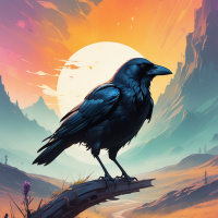 На картинке – ворон, сидящий на скале в сказочном пейзаже. На заднем плане возвышаются горы, детально прорисованные на фоне яркого заката или восхода. Небо переливается оттенками оранжевого и фиолетового у горизонта, постепенно переходя в желтый наверху. Звезды рассыпаны по ночному небу, создавая ощущение сумерек или рассвета.