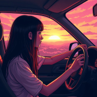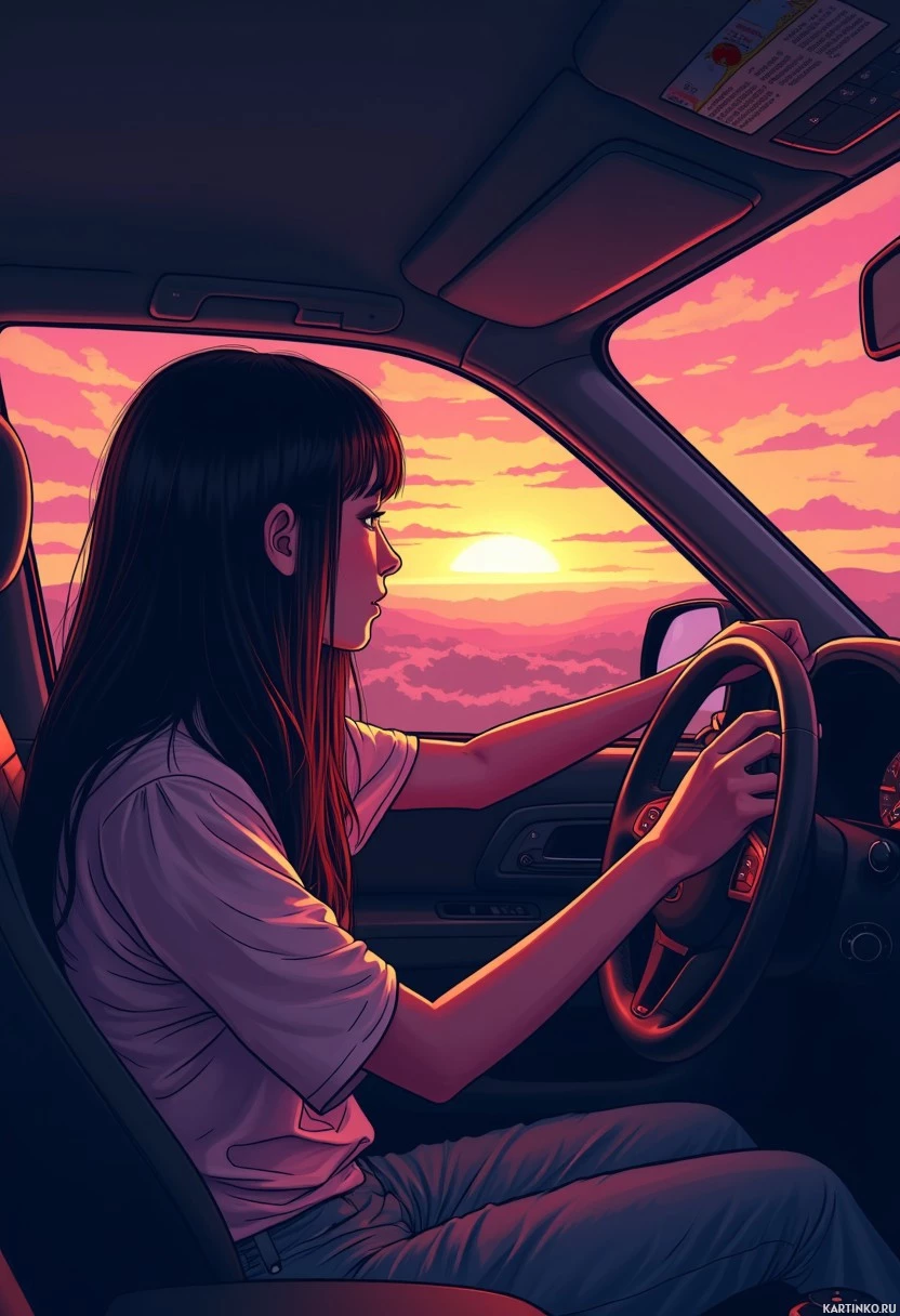 The image depicts an illustration of a girl sitting inside a car during sunset. She is wearing a white t-shirt and has long