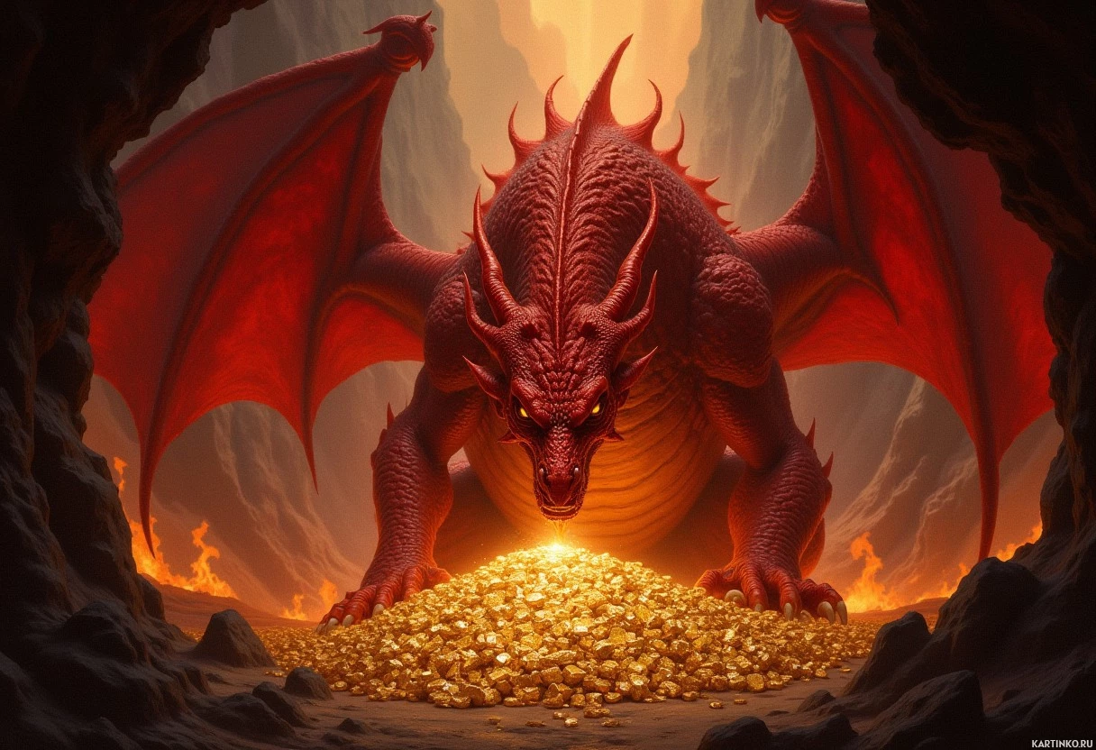 На картинке изобрана фантастическая сцена с драконоподобным существом с красными чешуйками и крыльями, которое стоит в центре. Кажется, оно охраняет или рассматривает кучу золотых монет, разбросанных вокруг на полу. Место действия указывает на вход в пещеру, что подтверждается скалистыми стенами и сталактитами, виднеющимися по краям. Общая атмосфера картинки мистическая и драматичная, характерная для фэнтезийных иллюстраций.