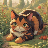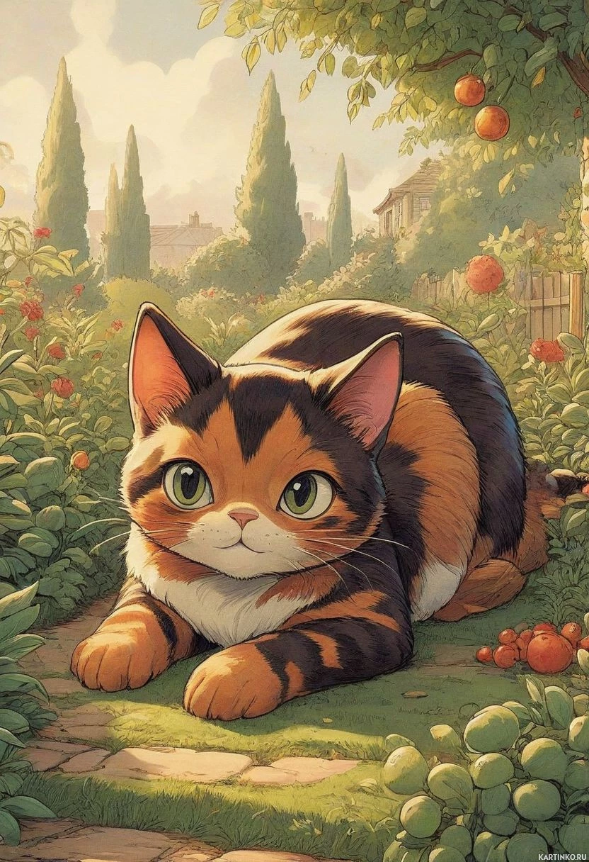 a sunny day with clear skies, and the surroundings suggest a garden or orchard setting, as indicated by the presence of apple trees and the overall idyllic atmosphere. The cat is depicted with