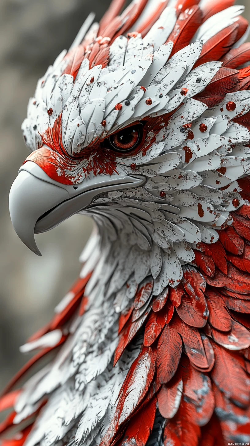 The image shows a detailed, artistic depiction of an eagle's head and shoulders. The bird features vibrant red and white plumage with black and gray markings on its face, particularly around the eyes and beak. It has