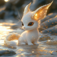 На картинке изобрарено маленькое существо, похожее на лису, с большими золотыми ушами и глазами, светящимися голубым светом. Существо сидит на берегу, вероятно, на рассвете или закате, судя по теплому свету, заливающему сцену. Вокруг головы существа парят золотистые частицы, намекающие на магию или мистику. На заднем плане видны камни и галька, разбросанные по земле. Общая атмосфера спокойная и мистическая.