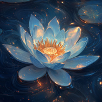 На картинке распустившийся лотос, освещенный ночной темнотой. Лепестки переливаются яркими оттенками синего и оранжевого, а в центре – ослепительно-желтый цвет, излучающий теплое сияние. Цветок расположен по центру на темном фоне, усыпанном едва заметными, похожими на звезды, источниками света. Слева видны зеленые листья или кувшинки, плавающие на воде и частично погруженные в нее. В нижнем правом углу, кажется, мерцают небольшие оранжевые точки, возможно, искры или звезды, сияющие в ночном небе. Картинка создана с использованием цифровой обработки и содержит элементы фантазии, что придает ей почти волшебную атмосферу.