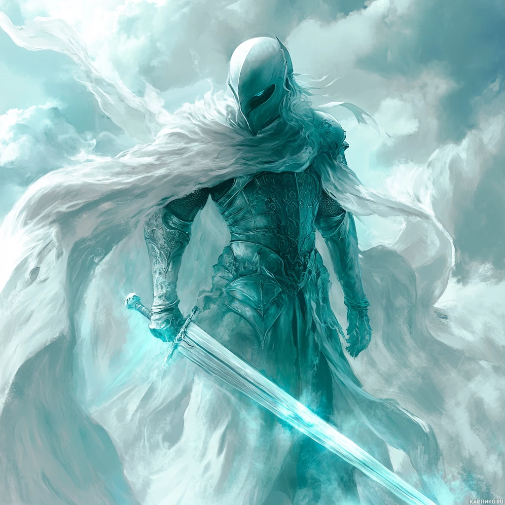 The image features a character who appears to be a warrior or knight. The individual is holding a sword with both hands, poised as if ready for combat. They are wearing armor and are draped in a cloak that adds