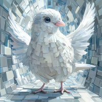 На картинке павлин-беляк стоит в открытом туннеле с высокими арками и купольным потолком. Крылья птицы широко распахнуты, демонстрируя сложный узор перьев, а тело остаётся неподвижным. Внутреннее убранство туннеля состоит из каменных блоков, расположенных таким образом, что создаётся ощущение глубины и перспективы.