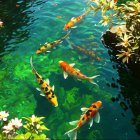 a small waterfall or rapids. The koi have vibrant colors typical of their species, with red-orange hues predominating on their bodies, and white markings that resemble cloud patterns on their scales. The overall mood of the image is calm and picturesque, evoking a sense of peacefulness often associated with natural landscapes. The colors are vibrant yet harmonious with the environment.