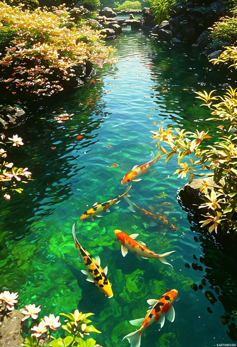 the serene atmosphere. Two koi fish are present in the scene. One koi is closer to the viewer and seems to be swimming towards the camera, while the other is farther away near