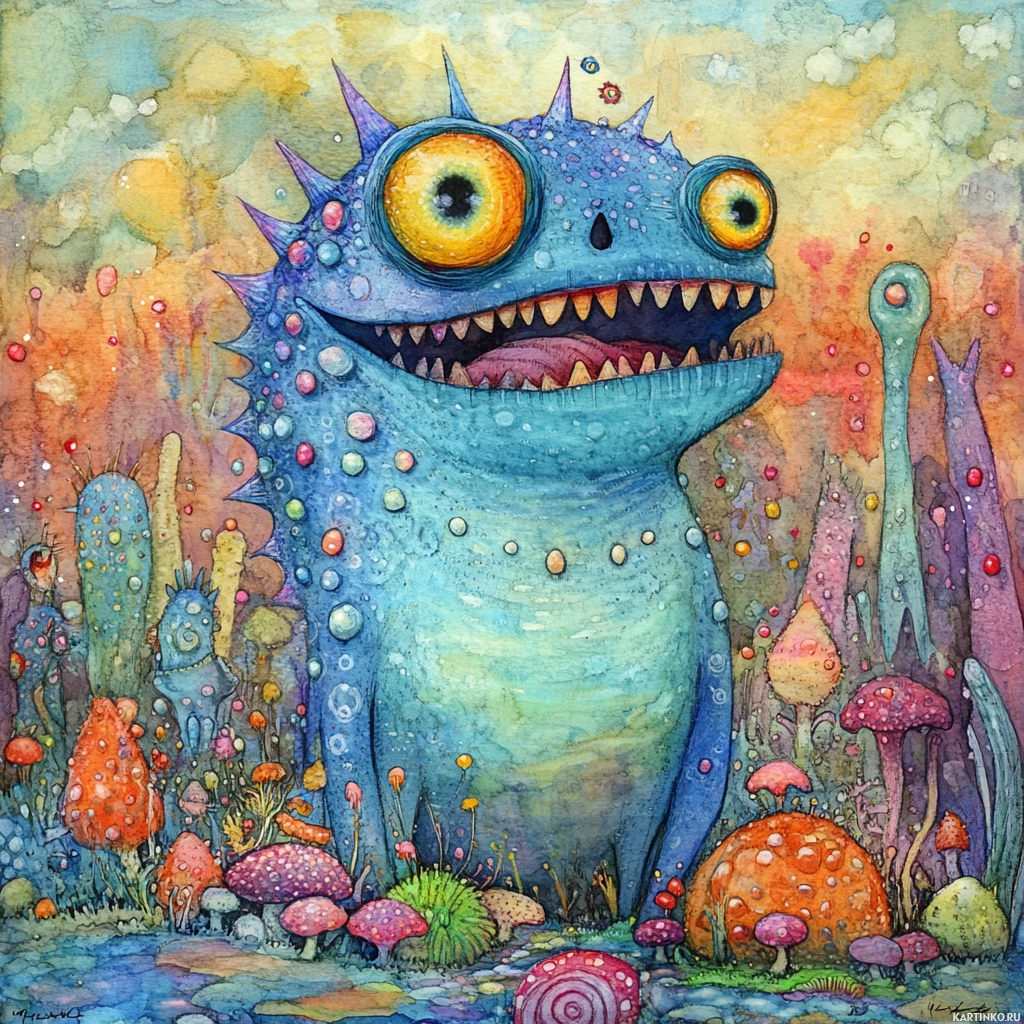 Картинка изображает причудливую сцену с антропоморфным монстром: у него колючий мех, большие выразительные глаза и широко открытый рот, обнажающий острые зубы. Это существо — главный объект картинки, оно стоит в центре на четвереньках. Вокруг него — различные элементы фэнтези, такие как грибы, растения и другие маленькие существа, похожие на морских обитателей, например, осьминог или кальмар с щупальцами. Фон имеет золотистый оттенок и выглядит как рассвет или закат, судя по мягкому освещению на линии горизонта. В небе также видны облака.