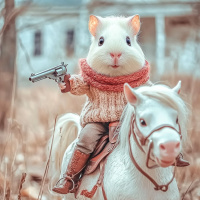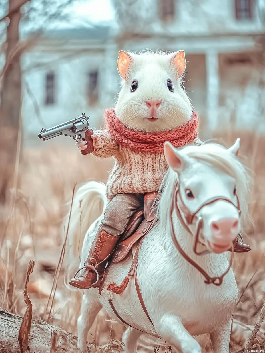 The image features an anthropomorphic guinea pig character wearing a vest and riding a white horse. The guinea pig is pointing a pistol towards the viewer, giving it a determined or defiant expression. The background appears to be a rural or semi-urban setting with bare trees, suggesting either autumn or winter.