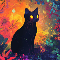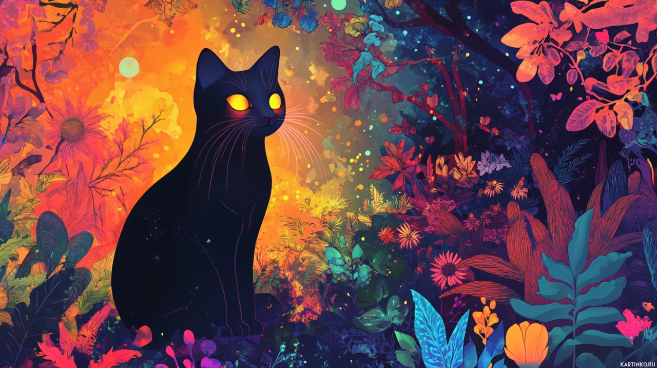 На картинке – чёрный кот сидит на камне на переднем плане. Голова повернута вправо, и кажется, что он спокоен и с любопытством смотрит на что-то за кадром. На заднем плане – яркий и сказочный пейзаж с деревьями, чьи листья напоминают звёзды или луны. Повсюду раскиданы цветы самых разных форм и размеров. Цветовая гамма состоит из фиолетовых, жёлтых, синих и зелёных оттенков, создающих ощущение волшебства.