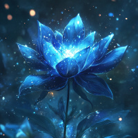 На картинке изображён огромный синий лотос с множеством лепестков, раскрывающихся из центра, на фоне тёмного неба, усыпанного звёздами. Каждый лепесток подсвечен мягким светом, исходящим из сердцевины цветка, создавая умиротворённую и загадочную атмосферу. Видны корни лотоса, уходящие в воду, а у основания стебля – небольшие растения или бутоны. Общее впечатление – утончённая красота и неземная прелесть.