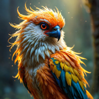 The image features an animated depiction of a bird with vibrant plumage in hues of yellow, orange, and blue. The bird has prominent features such as white feathers on its head, black eyes, and a sharp beak. It is perched on a rock or ledge with green moss or foliage beneath it, suggesting an outdoor setting with natural elements. The style of the image is reminiscent of digital art, characterized by smooth shading and attention to detail in the feather textures and the bird's facial expression.