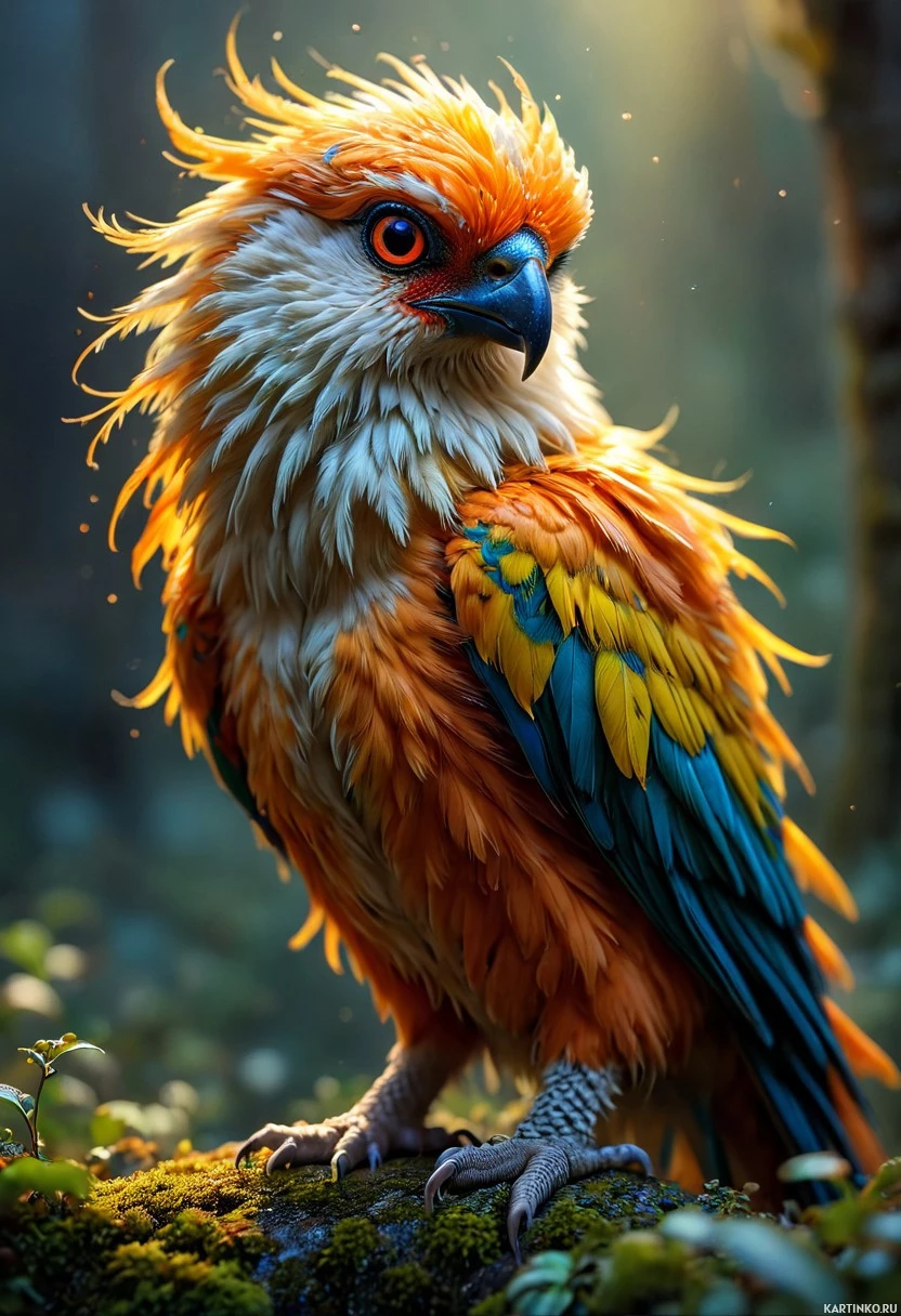 На картинке изображено анимированное изображение птицы с ярким оперением, сочетающим оттенки жёлтого, оранжевого и синего. У птицы выделяются белые перья на голове, чёрные глаза и острый клюв. Она сидит на камне или выступе, под которым виднеется зелёный мох или листва, что создаёт ощущение природы и открытого пространства. Стиль картинки напоминает цифровую живопись, отличающуюся плавными переходами и вниманием к деталям в текстуре перьев и выражении лица птицы.