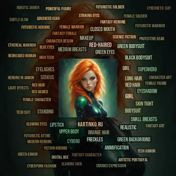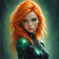 blue eyes. She is wearing a black and green bodysuit that appears to be made of some