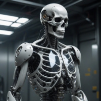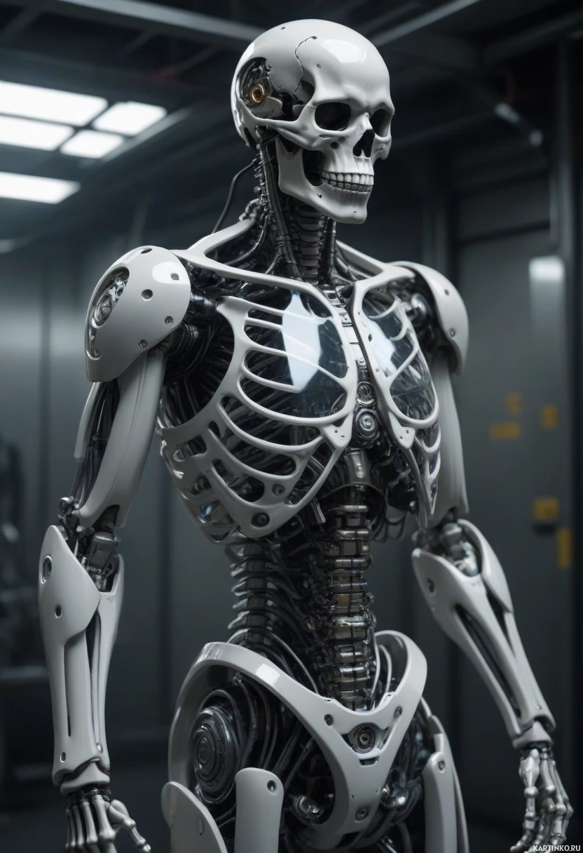science fiction themes. The robot is predominantly metallic in appearance, suggesting it might be made of robotics or artificial materials. It stands inside what appears to be an industrial or manufacturing environment, characterized by its mechanical and utilitarian design. The robot's pose suggests a stance that could indicate curiosity or observation. The overall impression is one of