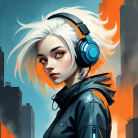 white hair wearing headphones. She is dressed in