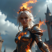 white hair. She is wearing armor and has fire emanating from her head, indicating that she may have