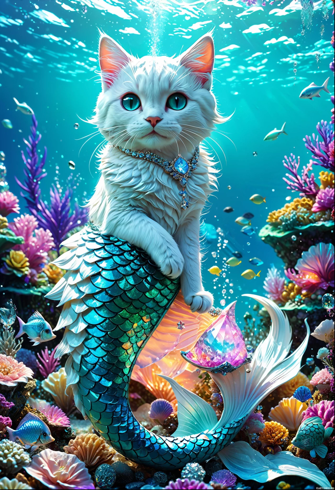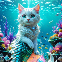 marine life that includes fish and corals in shades of pink, purple, and blue. The cat's tail has been transformed into a mermaid-like tail, suggesting it has magical abilities or is