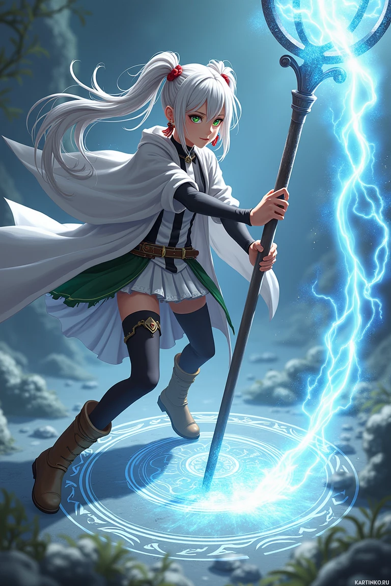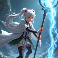 white hair, styled in what appears to be an elfin manner. This character is wearing a costume that includes a cloak and a skirt with