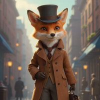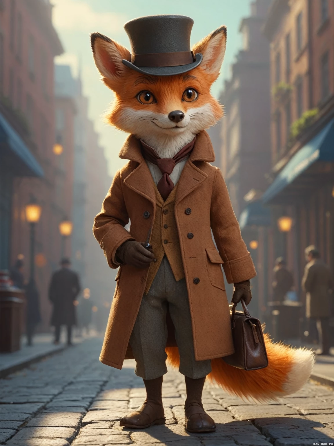 На картинке изображена антропоморфная лиса, стоящая на задних лапах и одетая в викторианском стиле, что напоминает кадры из исторических драм. На ней высокий цилиндр, распространенный аксессуар для персонажей высшего сословия в предлагаемом историческом контексте. Тело и черты лица типичны для лисы, однако одежда и поза придают ей человеческий облик, отражая антропоморфное изображение. Задний план представляет собой старинную европейскую улочку с мощёным тротуаром, традиционными магазинами по обеим сторонам и фоном, намекающим на историческую или фэнтезийную обстановку. Лиса расположена в центре кадра, стоит, положив одну руку на бедро, а в другой держит, похоже, карманные часы, что добавляет образу элегантности.