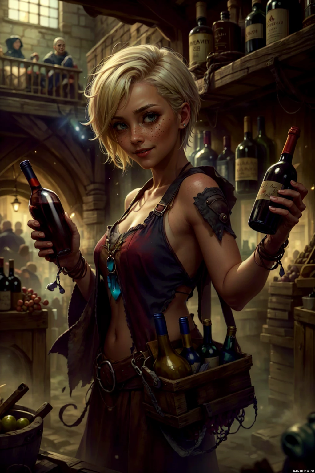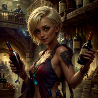 На картинке на переднем плане изображена женщина в костюме, напоминающем фантазийный или исторический наряд. У нее короткие светлые волосы, и она держит в руках две бутылки вина. На заднем плане видны несколько фигур, занятых какими-то делами, возможно, в таверне или винодельне. Освещение создает ощущение теплой, уютной обстановки. Справа виден бочонок, а слева – большой казан.