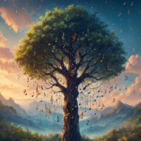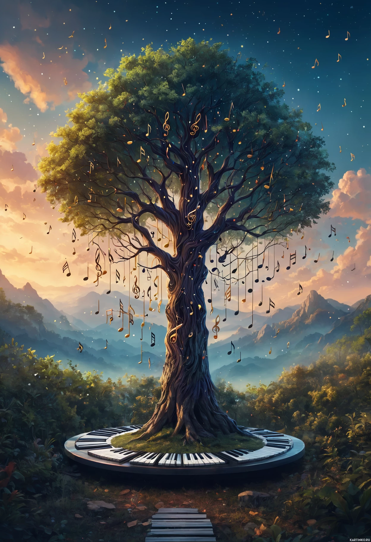На картинке выделяется большое дерево, расположенное в центре. На его ветвях развешены различные музыкальные ноты, что указывает на музыкальную тематику. У подножия дерева создано расположение, напоминающее клавиши пианино, символизируя связь между природой и музыкой. Фон изображает безмятежный пейзаж с горами на фоне звездного неба. Освещение предполагает либо восход, либо закат солнца, судя по мягким оттенкам. Общая атмосфера картинки – умиротворенная и мистическая, вызывающая ощущение гармонии между музыкой и природой.
