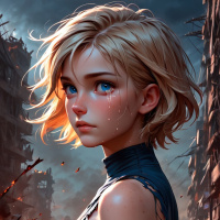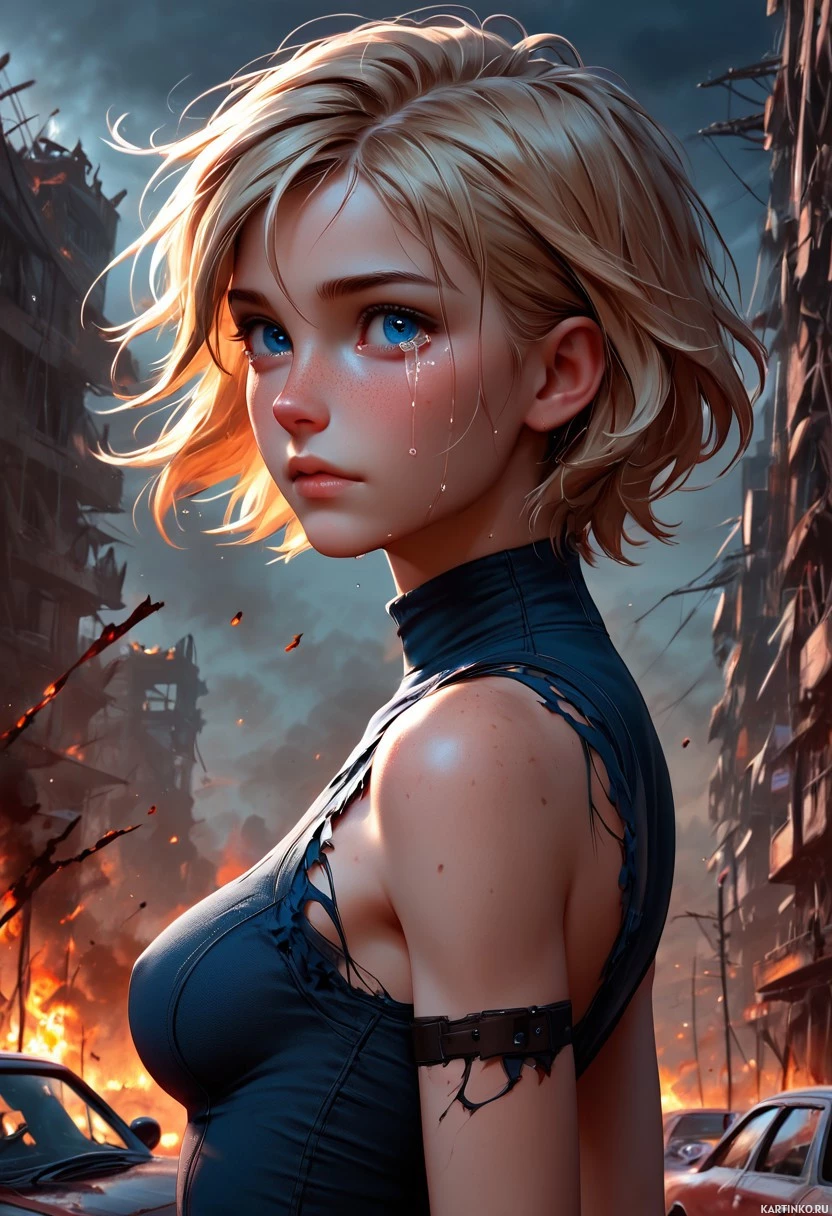a female character with blonde hair, tears streaming down her face. She is set against a post-apocalyptic background featuring burning buildings and rubble, suggesting
