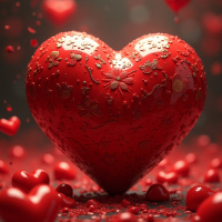 The image displays a large red heart centered in the frame. Surrounding the central heart are numerous smaller hearts, all in shades of red and white, giving the impression of an explosion of hearts from behind the central one. These surrounding hearts are scattered throughout the image. Additionally, there appear to be small, round objects that look like seeds or grains, which are also colored in shades of red and white, creating a visual effect similar to spilled seed pumpkins around the heart. The background is dark, possibly black, providing a stark contrast to the vibrant colors of the hearts. The style of the image is illustrative with a sense of motion conveyed by the arrangement of the hearts and seeds around the central one.