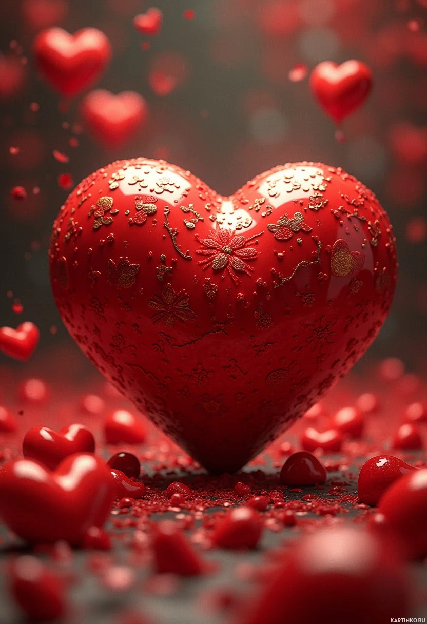 На картинке большое красное сердце, расположенное в центре кадра. Вокруг него – множество маленьких сердец разных оттенков красного и белого, создающих ощущение, будто они вырываются из-за центрального. Эти сердечки разбросаны по всей картинке. Также заметны небольшие круглые объекты, похожие на семена или зерна, раскрашенные в те же оттенки красного и белого, напоминая пролитые тыквенные семечки вокруг сердца. Фон темный, возможно, черный, что создает резкий контраст с яркими цветами сердец. Стиль картинки иллюстративный, а ощущение движения передано расположением сердец и семян вокруг центрального.