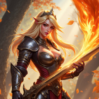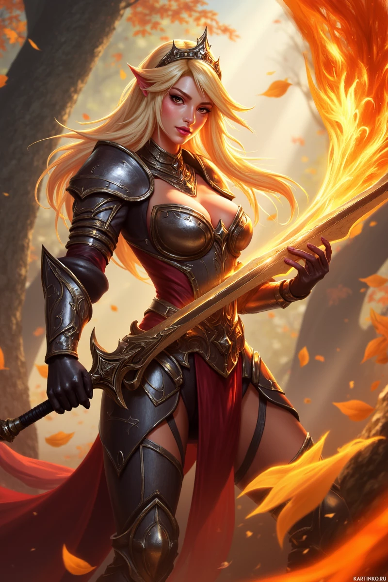 blonde hair and is wearing silver armor with red accents, including gauntlets and boots that have flame designs. Her attire also includes a skirt made of what appears to be