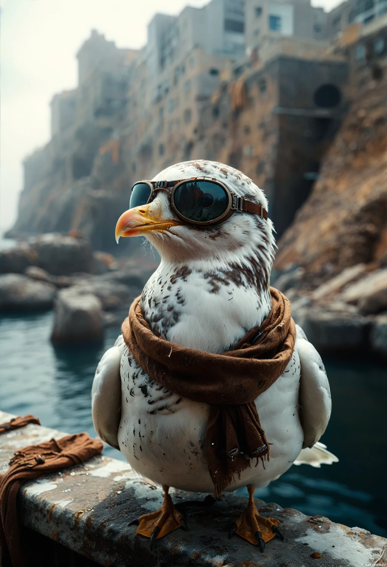 The image shows a seagull wearing sunglasses and a scarf with stripes on its neck, sitting at the edge of a body of water, which appears to be a river or canal. There are buildings along the opposite shore, and the overall scene suggests an urban environment close to a coastline. The seagull is perched on what looks like a stone ledge or barrier. The style of the image is whimsical and artistic, as it portrays human accessories on an animal in a natural setting.