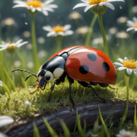 На картинке изображена красная божья коровка с черными точками на спинке и крыльях, расположенная справа в кадре. Она стоит на мшистой или травянистой поверхности. Слева от насекомого – белые цветы с жёлтыми серединками, похожие на ромашки. Фон приглушённый, создаёт ощущение раннего утра или позднего вечера, а мягкий свет пробивается сквозь ветви деревьев и листву.