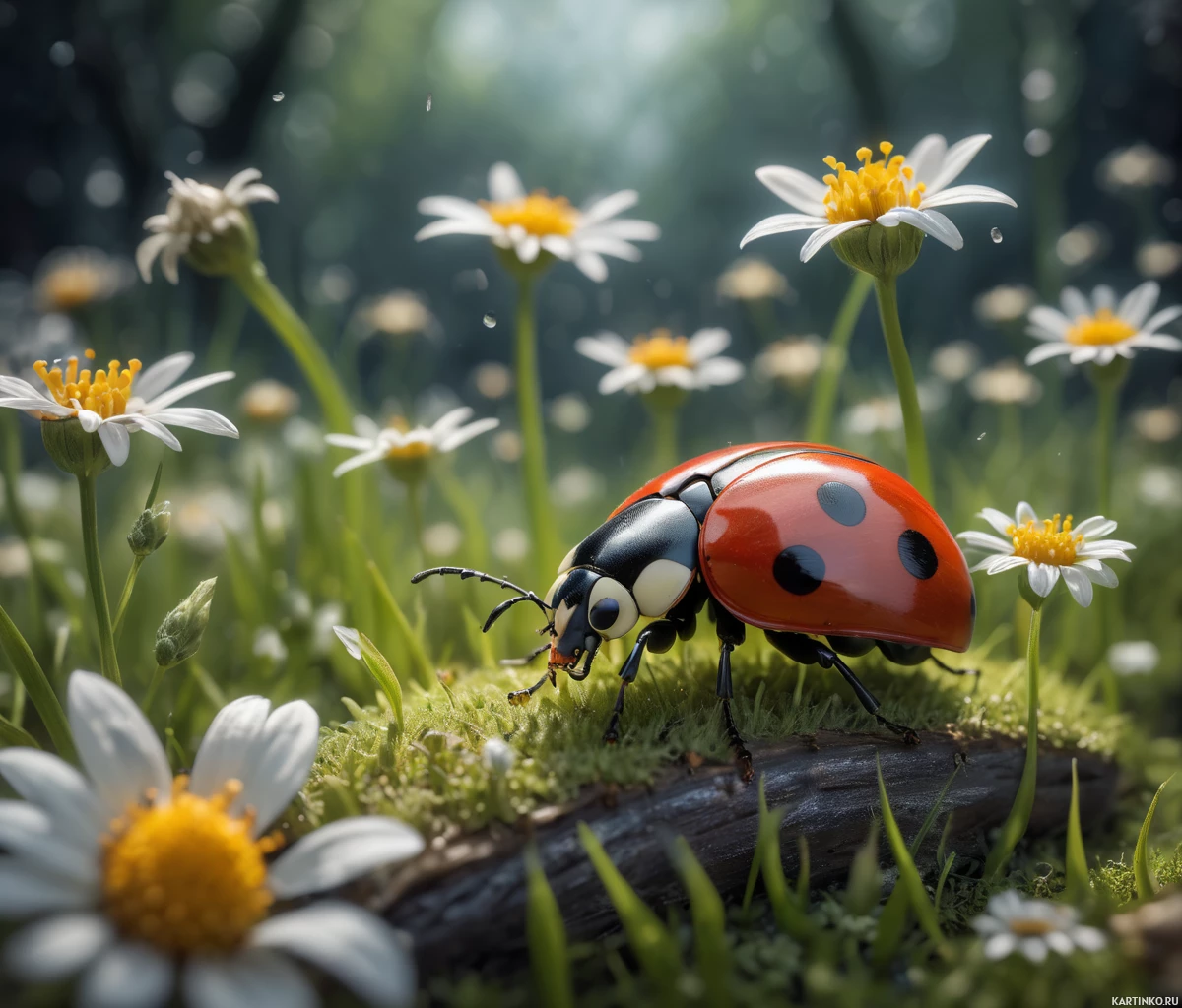 The image shows a red and black ladybug (also known as a lady beetle) perched on a small branch amidst