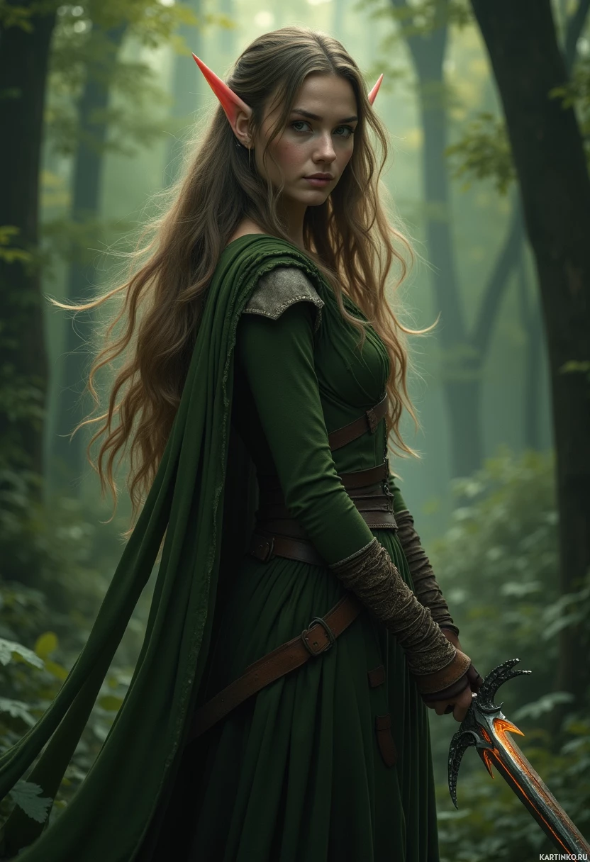 a high collar, resembling the attire of traditional fantasy elves. Her expression is serious as she gazes off to one side, not directly looking at the viewer. She carries an elegantly designed sword, which matches her outfit, suggesting a role that might be indicative of her character in the context of the story or setting this image represents. The presence of mist and fog enhances