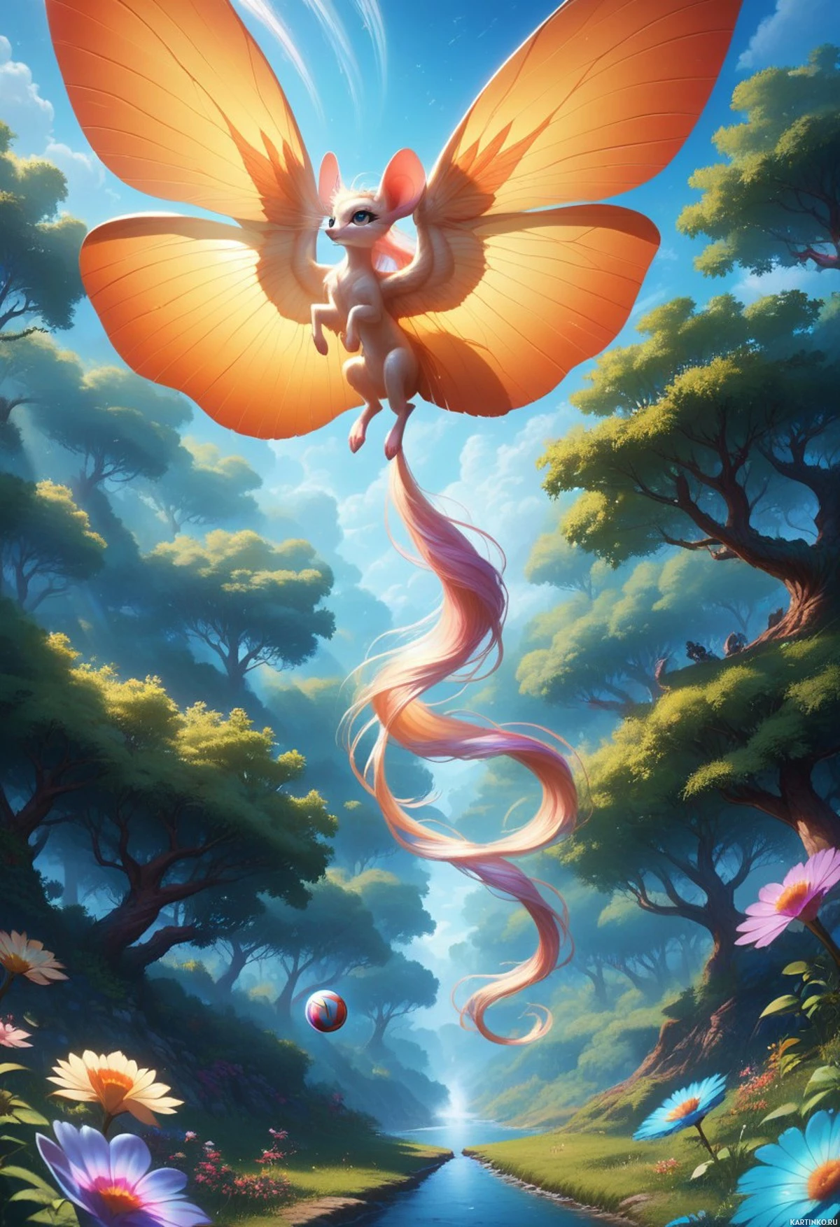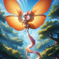 a bushy tail similar to that of a traditional fox. The creature stands upright, much like humans do, and it appears to be in a state of motion or flight, given the spread of its wings. The setting is a serene and lush environment, featuring towering trees with