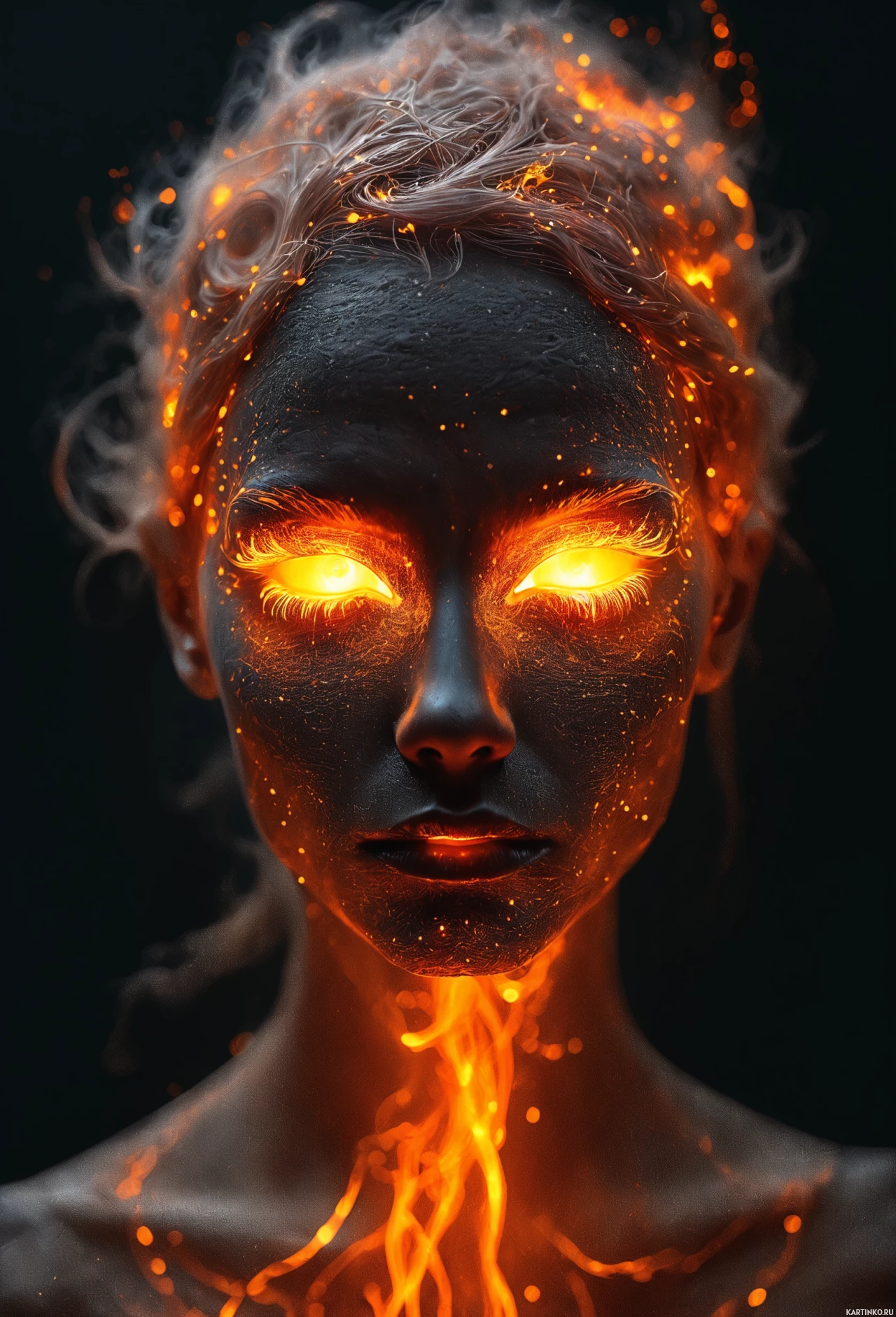 Картинка демонстрирует крупный план лица с использованием художественных визуальных эффектов. На изображении женщина, ее кожа имеет тёмный, металлический блеск с красноватым оттенком, напоминающий расплавленный металл или лаву. Ее глаза выразительны и окружены мелкими искрами, словно они пылают огнем. Привлекает внимание узор на лице, похожий на языки пламени или тлеющие угли, который распространяется от глаз и охватывает нижнюю часть головы, создавая впечатление огненного головного убора или маски. Цветовая палитра состоит из красных и тёмных тонов с редкими жёлтыми акцентами, которые можно интерпретировать как искры или отражение света на металлической поверхности. Картинка выполнена в очень стилизованном виде с драматическим освещением, которое подчеркивает металлическую текстуру и огненную тематику. Фон минималистичен, чтобы акцентировать внимание на лице и художественных элементах.