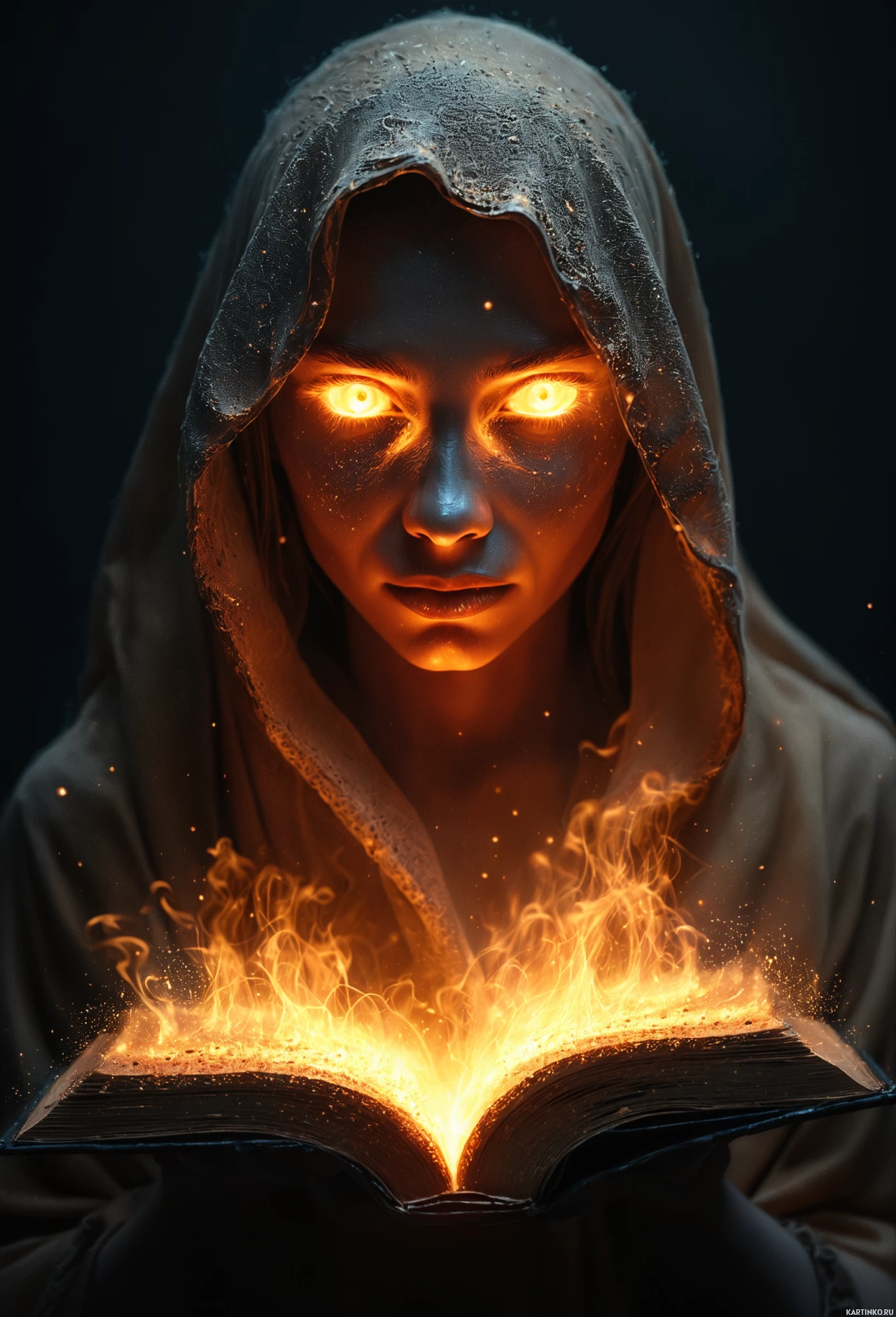 На картинке изображен человек в капюшоне, по-видимому, занятый чем-то, связанным с фэнтези. У него сосредоточенное выражение лица, и он держит открытую книгу, из страниц которой вырываются языки пламени – очевидно, это проявление какой-то магической силы. Фон темный, что создает резкий контраст с освещенной книгой и усиливает драматический эффект.